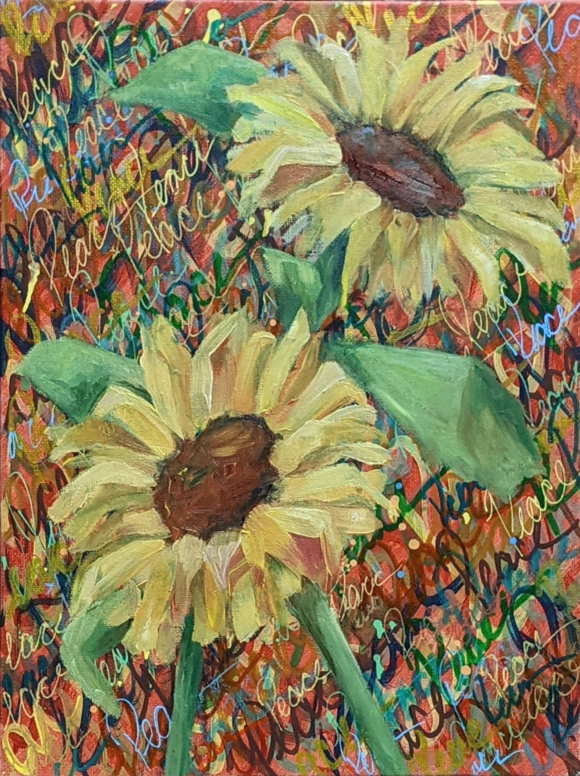 This painting marks both my first venture into oil painting and into this particular style. Created in response to the 2022 war in Ukraine, the sepia background recalls the red clay of the earth, speaking to our shared roots. Across this surface, the layered word “peace” forms a textured turbulence, from which a pair of sunflowers emerge — a quiet hope for harmony between nations.